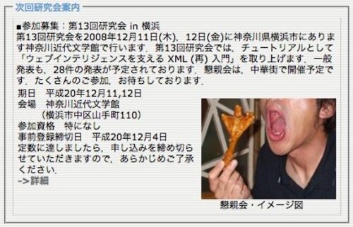 久しぶりに明日参加予定の某研究会のホームページを見て爆笑(いつもはメールしか見ていないのだ) 追記:モデルはこの研究会の委員長らしい(笑)